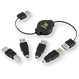 Retractable USB 2.0 A-Male to A-Female Cable with 4 Interchangeable Adapter Tips: USB-B, Mini 5 Pin, Mini 4-Pin, and Mini 4-Pin Flat. Adapter to all USB Types